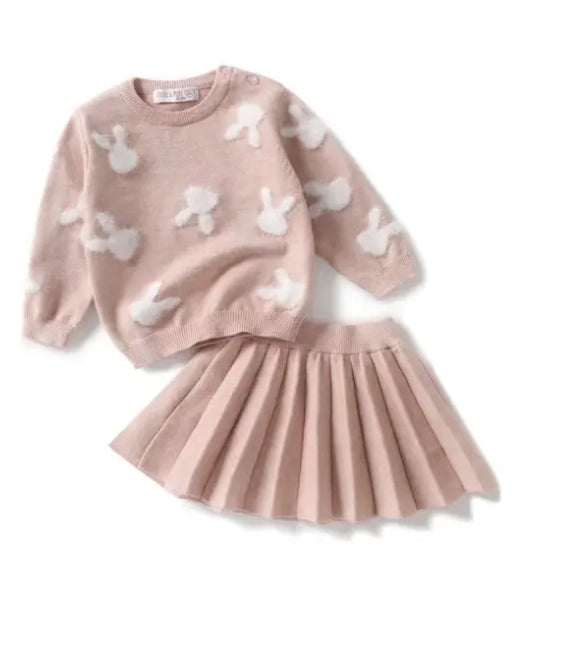 Plooirok en trui met konijntjes.